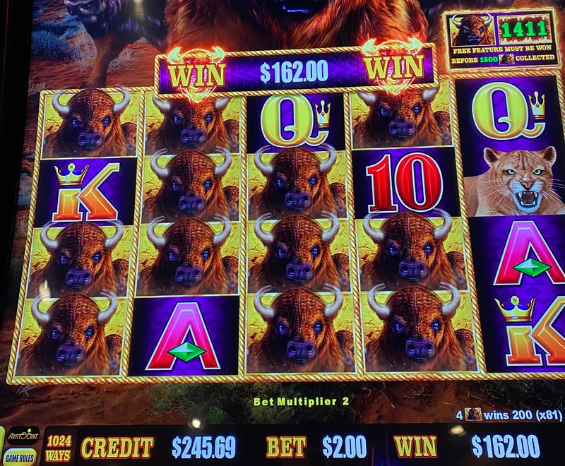 Buffalo Link has a bonus feature that is triggered by accumulating buffalo heads. The buffalo head counter begins at 100 and the feature must hit before 1800. 1610 or higher (displayed in green text on the counter…